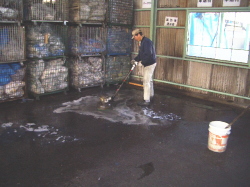 洗剤をまいて、ポリッシャーで床磨きをしました。ポリッシャーの後はバキュームで吸水です。 |